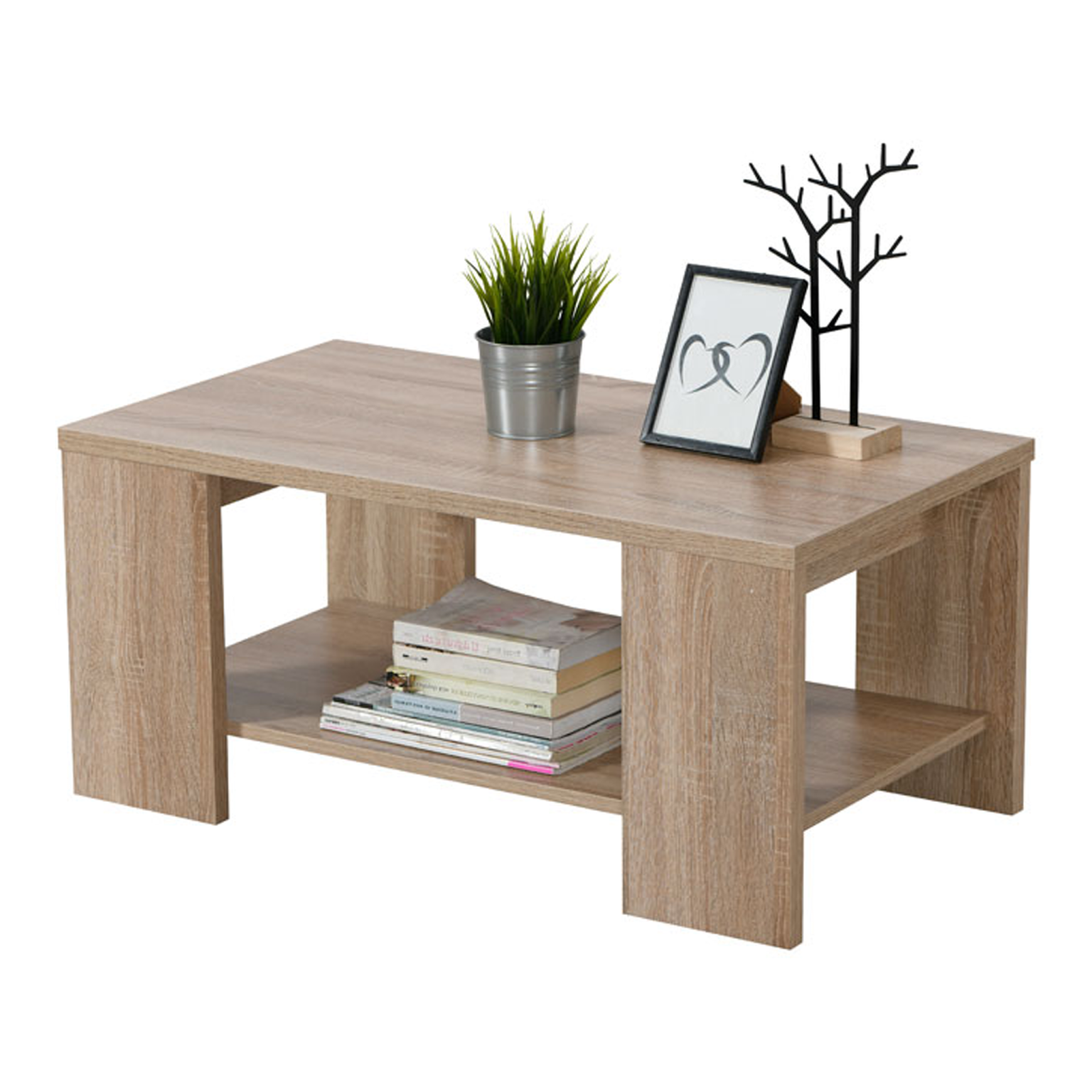Tavolinë mesi me dizajn të thjeshtë dhe modern në efekt druri natyral, që sjell ngrohtësi në çdo ambient. Dy nivelet ofrojnë hapësirë praktike për libra, revista apo aksesorë dekorativë.