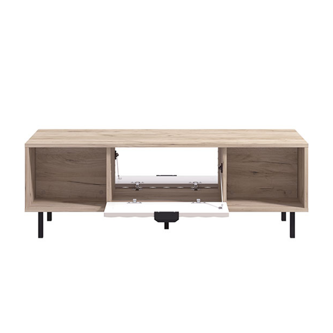 Tavolinë mesi me dizajn modern në efekt druri natyral dhe këmbë metalike të zeza, që i japin një pamje elegante dhe bashkëkohore. Përfshin hapësira të hapura anësore dhe një ndarje qendrore praktike për organizimin e librave, aksesorëve apo objekteve të përditshme.