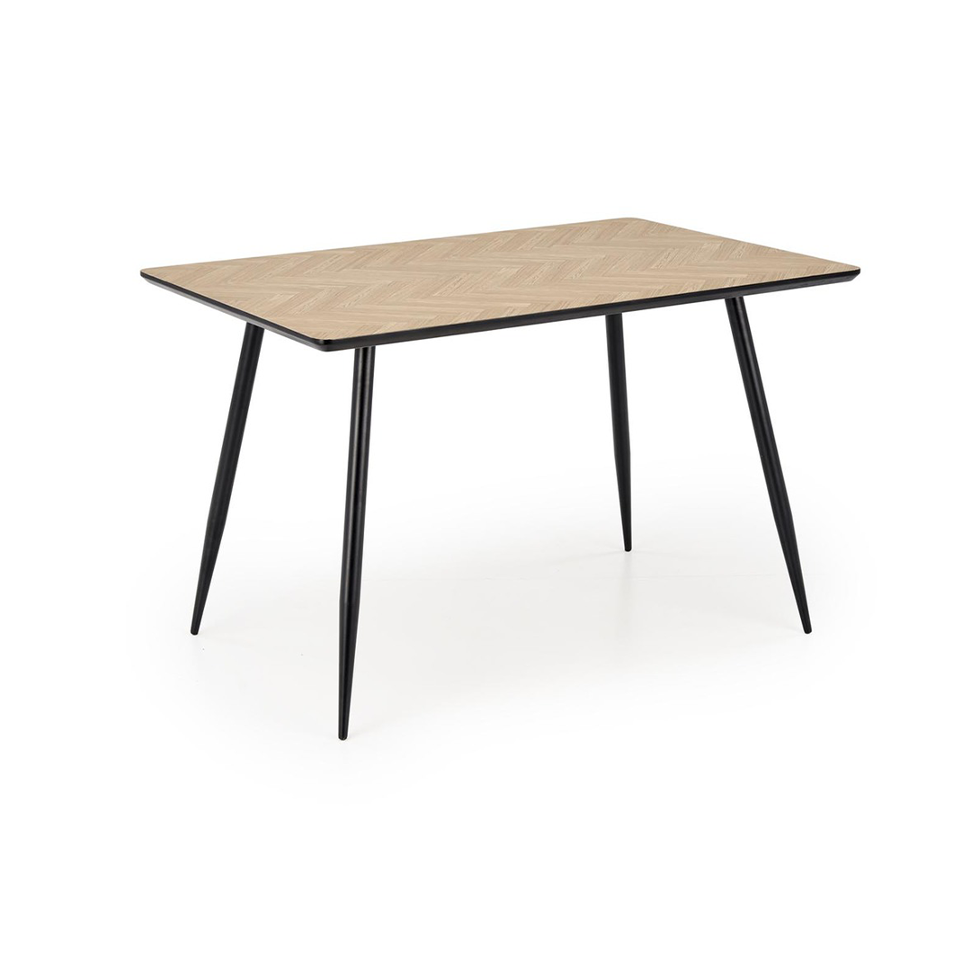 Tavolinë elegante me dizajn modern, e përshtatshme për kuzhinë apo dhomë ngrënieje. Kombinimi i sipërfaqes me efekt druri dhe këmbëve metalike të zeza krijon një pamje bashkëkohore dhe të qëndrueshme, që përshtatet lehtësisht me stile të ndryshme interieri.