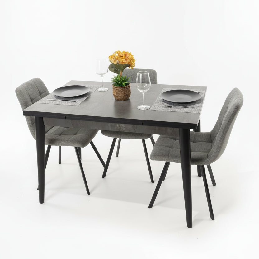 Kjo tavolinë ngrënie dallohet për pamjen moderne dhe elegante, duke kombinuar një sipërfaqe në nuancë gri me efekt guri dhe këmbë metalike të zeza. Dizajni i saj i pastër dhe bashkëkohor krijon një atmosferë sofistikuar në çdo ambient, duke u përshtatur lehtësisht me stile të ndryshme arredimi.
