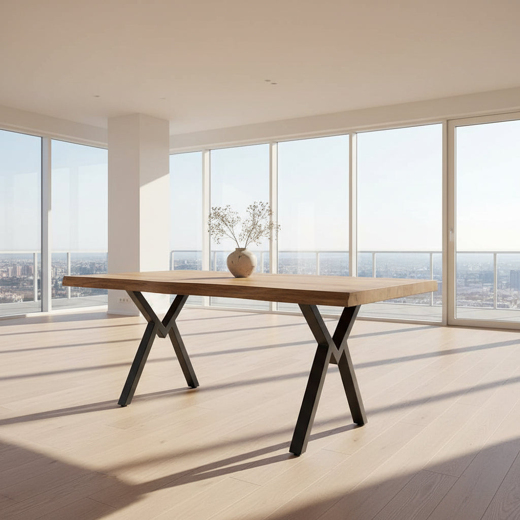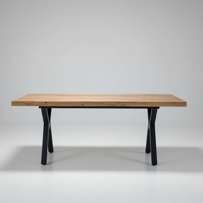 Tavolinë ngrënieje me dizajn elegant dhe karakter natyral, e kombinuar me këmbë metalike në formë X për një pamje moderne dhe të qëndrueshme. Sipërfaqja me efekt druri sjell ngrohtësi në ambient, duke u përshtatur lehtësisht me stile të ndryshme interieri.