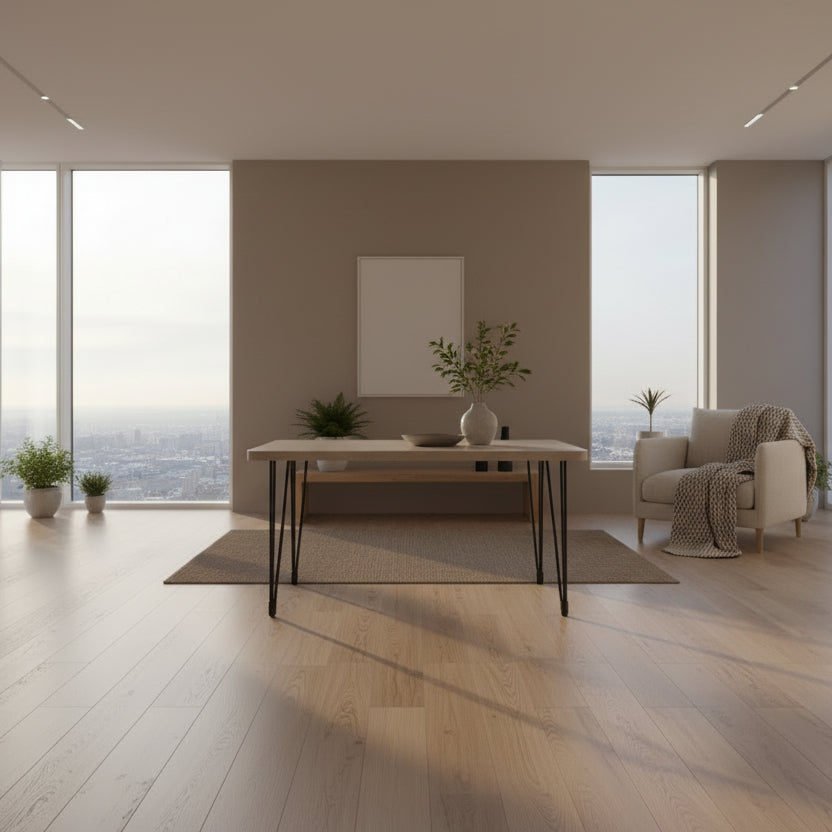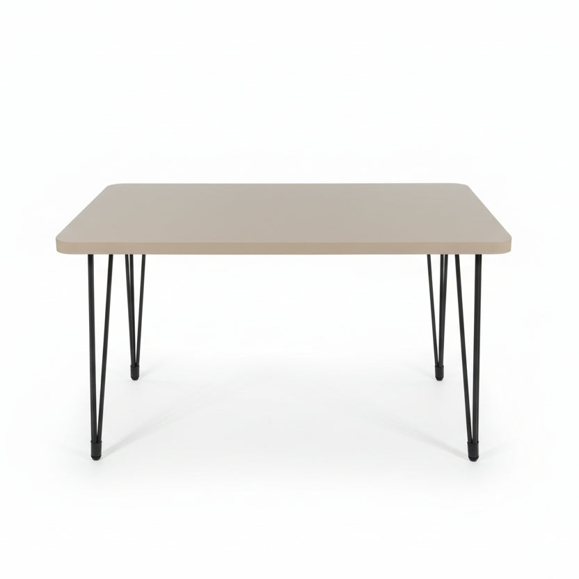 Kjo tavolinë elegante dhe funksionale është ideale për kuzhinë, dhomë ngrënieje ose zyrë. Dizajni minimalist me sipërfaqe të rrafshët dhe këmbë metalike të forta i jep një pamje moderne dhe të qëndrueshme. Madhësia kompakte e bën perfekte për ambiente të vogla dhe të mesme, duke ofruar hapësirë të mjaftueshme për përdorim të përditshëm.