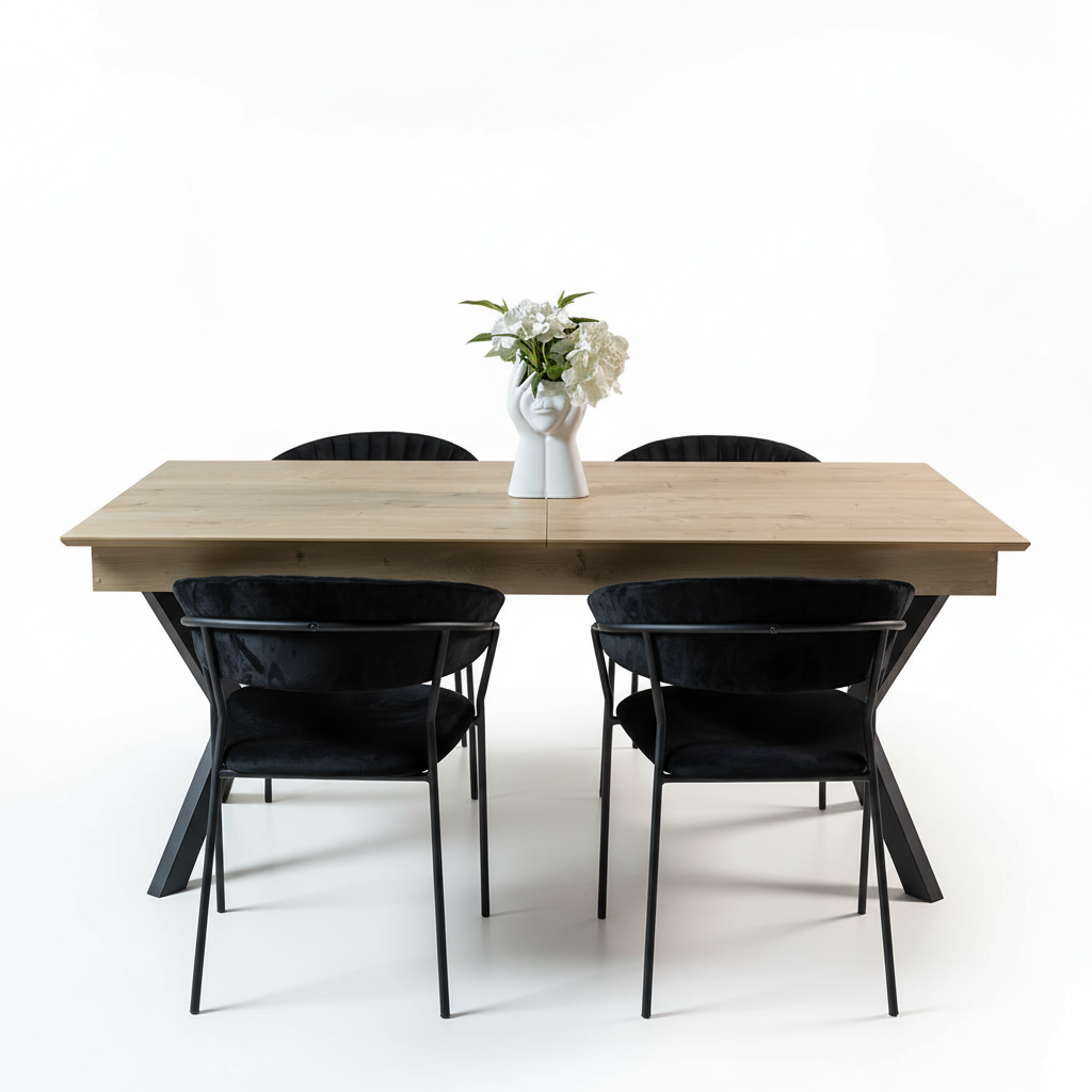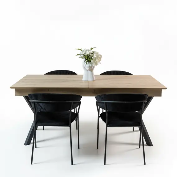 Kjo tavolinë ngrënieje kombinon thjeshtësinë moderne me karakterin e stilit industrial. Sipërfaqja në nuancë druri natyral krijon një ndjesi të ngrohtë dhe mikpritëse, ndërsa këmbët metalike të zeza i japin stabilitet dhe një pamje bashkëkohore.