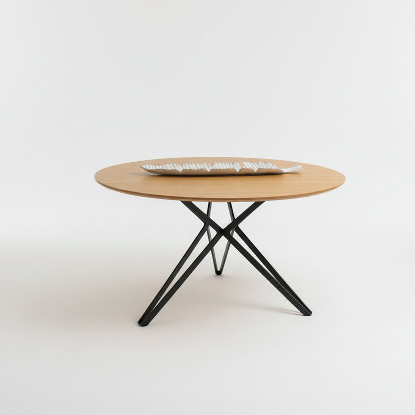 Sipërfaqja e saj në ngjyrë Lisi Natyral (Oak) sjell ngrohtësi, ndërsa këmbët e zeza metalike i japin atë prekjen industriale që është aq shumë në modë. Forma e saj e rrumbullakët/ovale është ideale për të krijuar një atmosferë intime dhe sociale gjatë ngrënies.