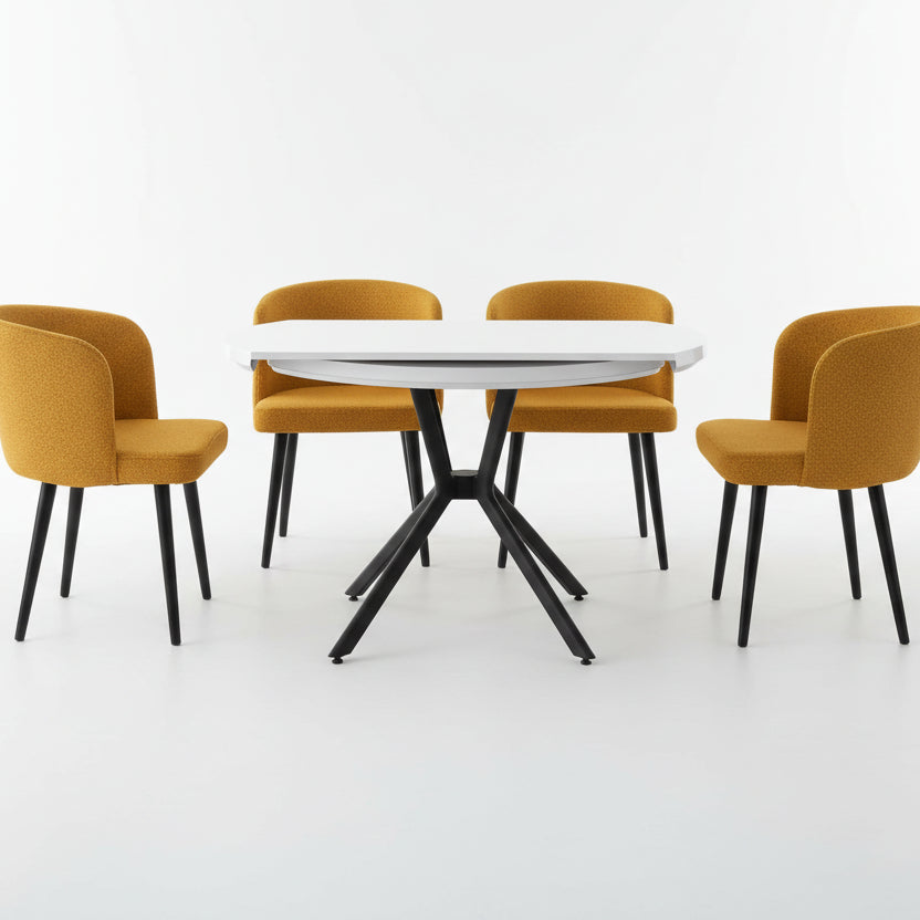 Tavolinë ngrënieje me formë të rrumbullakët dhe dizajn modern, e përshtatshme për ambiente bashkëkohore dhe elegante. Sipërfaqja në ngjyrë të bardhë krijon një ndjesi pastërtie dhe hapësire, ndërsa baza metalike me formë gjeometrike siguron stabilitet dhe stil unik.