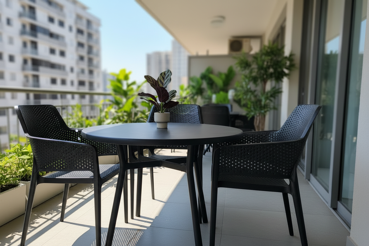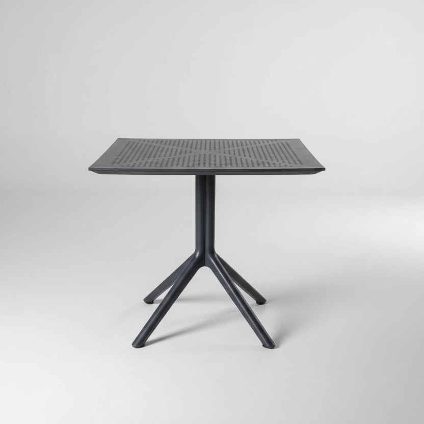 Tavolina outdoor Ama me ngjyrë antraciti sjell një sipërfaqe funksionale 80x80 cm për ambientet tuaja të jashtme, me dizajn modern plastik dhe bazë të qëndrueshme me katër këmbë.