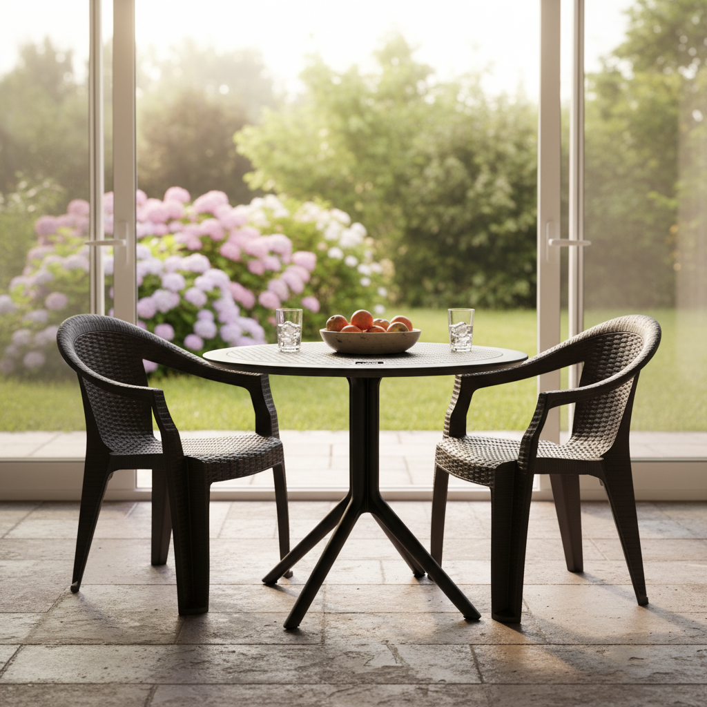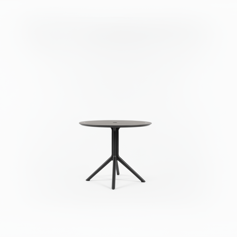 Tavolina plastike me ngjyrë antraciti është ideale për përdorim në ambiente të jashtme, me sipërfaqe të rrumbullakët 90 cm që ofron hapësirë të mjaftueshme për ulje komode. Dizajni modern me bazë katërkëmëshe e bën të përshtatshme për ballkon, tarracë ose kopsht.