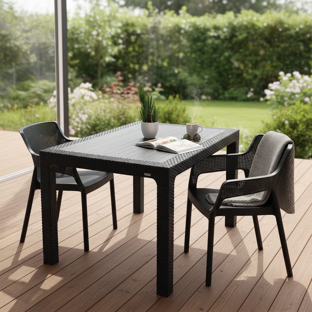 - Konstruktion ratan plastike në ngjyrë antracit për pamje elegante dhe uniforme.