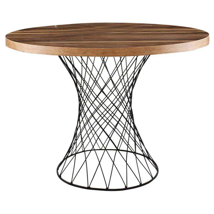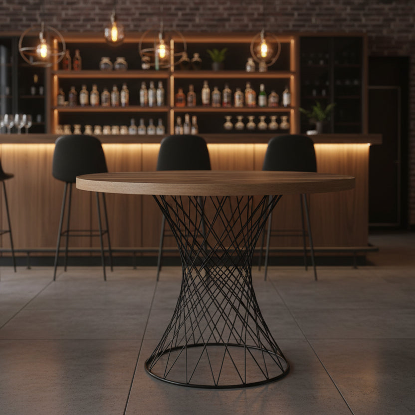 Tavolinë ngrënieje me formë rrethore dhe dizajn bashkëkohor, që sjell një ndjesi të ngrohtë dhe elegante në çdo ambient. Sipërfaqja me efekt druri natyral kombinohet në mënyrë perfekte me bazën metalike artistike, duke krijuar një pamje unike dhe moderne.