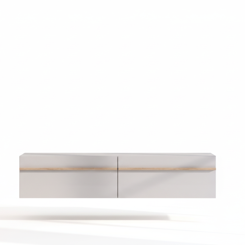 Tavolinë televizori moderne me dizajn minimalist dhe linja të pastra, ideale për ambiente bashkëkohore. Kombinimi i ngjyrës së bardhë me detajin në efekt druri krijon një pamje elegante dhe të ngrohtë, që përshtatet lehtësisht me stile të ndryshme interieri. Struktura e varur në mur i jep hapësirës një ndjesi më të lehtë dhe moderne, ndërsa hapësira e mbyllur ofron vend praktik për pajisje dhe aksesorë multimedialë.