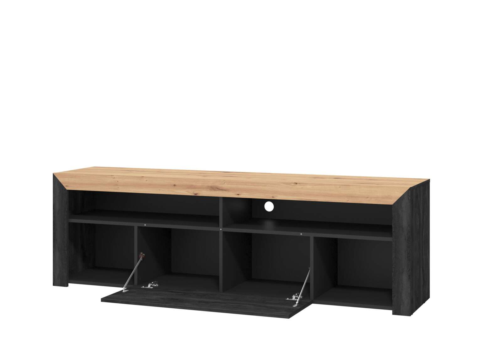 Rafti i televizorit ALASKA në kombinimin e karbonit dhe dekorit artizanal të lisit është një zgjidhje estetike për të dekoruar ambientin e dhomës së ndenjes. Funksionaliteti i tij theksohet nga raftet e hapura dhe të mbyllura, si dhe hapësira për pajisje audio-vizuale.