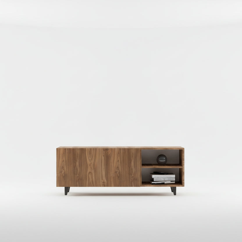 Tavolinë televizori me dizajn modern dhe linja të pastra, e realizuar në efekt natyral druri për një pamje të ngrohtë dhe elegante. Struktura kombinon hapësirën e mbyllur për ruajtje me raftë të hapur, ideale për pajisje multimediale, libra apo dekorime. Këmbët e errëta i japin stabilitet dhe një prekje bashkëkohore mobiljes.