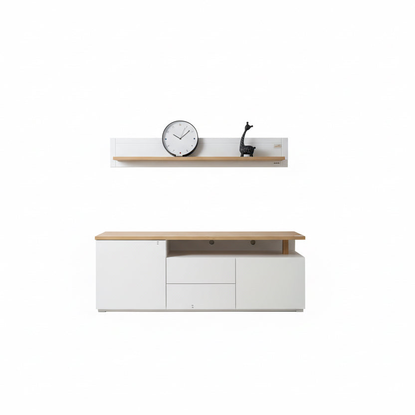 Ky sistem mobilje për TV është një kombinim perfekt i dizajnit minimal dhe funksional. Me një sipërfaqe të pasme druri natyral dhe pjesë të bardha të pastra, ky mobilje është ideal për dhomën tuaj të ndenjës, duke ofruar hapësirë për ruajtje të pajisjeve dhe objekteve dekorative.