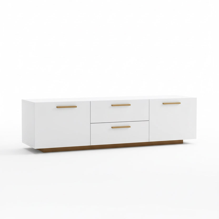Ky sistem mobilje TV ofron një pamje moderne dhe të pastër me ngjyrë të bardhë dhe detaje druri natyral. Me sirtarë të shumtë për ruajtje dhe një dizajn minimalist, kjo mobilje është e përshtatshme për çdo dhomë ndenjë që kërkon funksionalitet dhe estetikë.