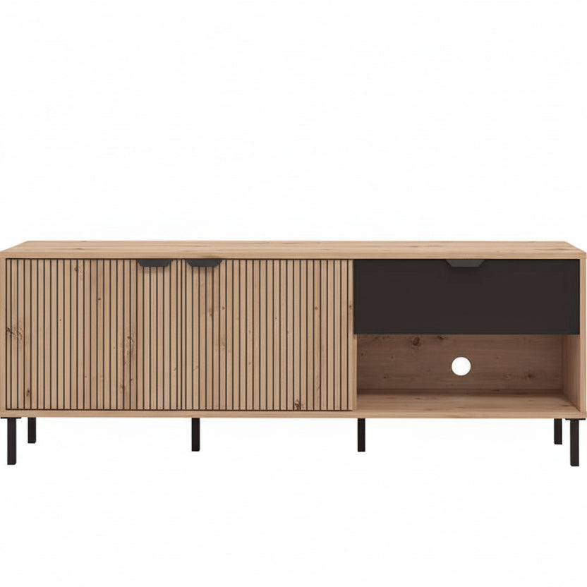 Tavolinë Televizori Manila është një mobilje moderne me karakter të veçantë, e dalluar për fasadën me detaje vertikale dhe kombinimin elegant të nuancës së drurit natyral me elemente të errëta. Dizajni i saj bashkëkohor i jep ambientit një pamje të ngrohtë dhe të rafinuar, duke u përshtatur lehtësisht me stile të ndryshme interieri.