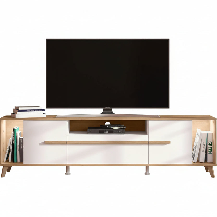 Mobilje TV me dizajn minimalist dhe kombinim elegant të ngjyrës së bardhë me efekt druri natyral, që sjell ndjesi të pastër dhe bashkëkohore në ambientin e ndenjës. Ofron hapësira të mbyllura dhe të hapura për organizimin e pajisjeve elektronike, librave apo aksesorëve dekorativë.