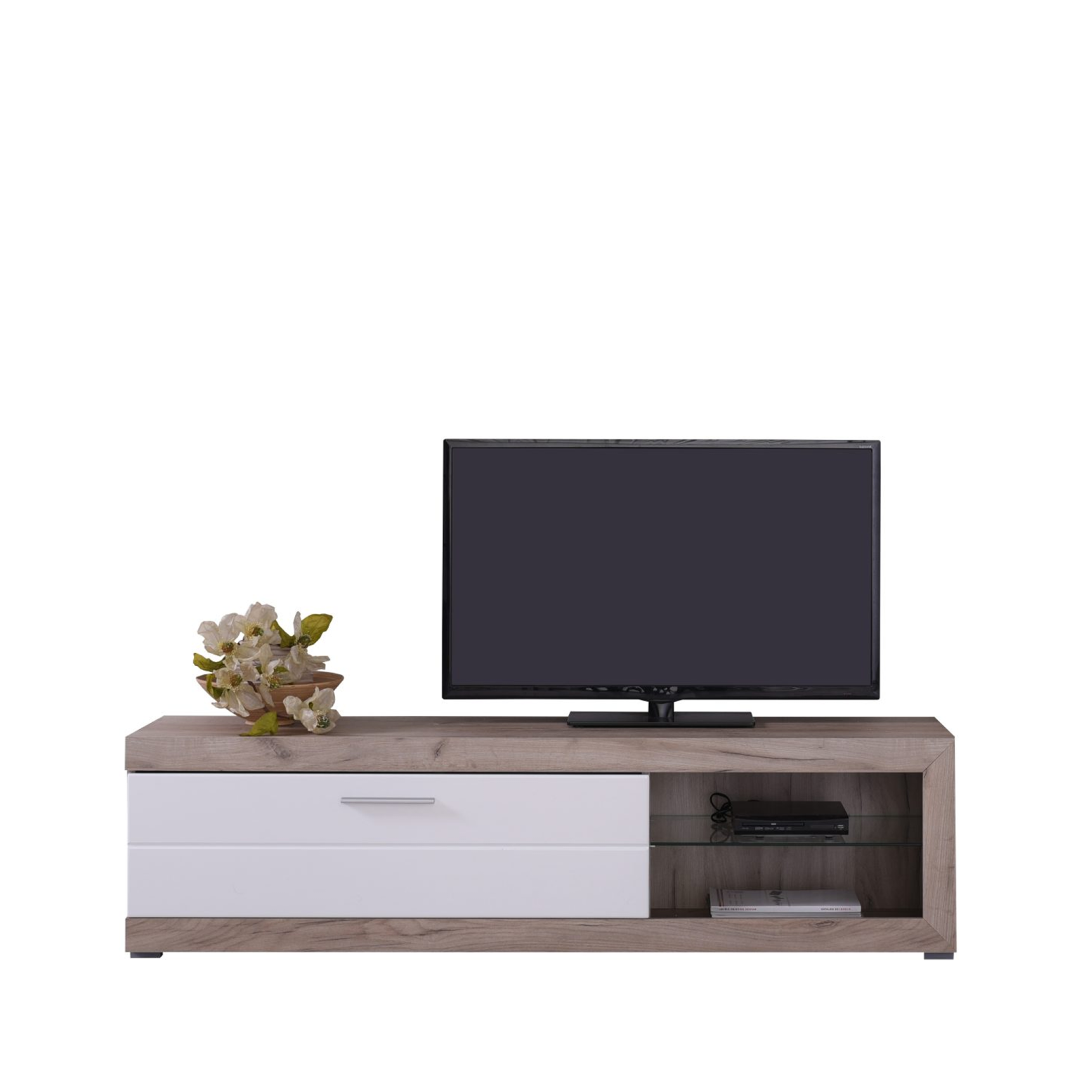 Mobilje TV me dizajn bashkëkohor që kombinon nuancën natyrale të drurit me elementë të bardhë për një pamje të pastër dhe elegante. Përfshin një sirtar të gjerë dhe hapësirë të hapur me raft xhami, ideale për pajisje elektronike dhe aksesorë.