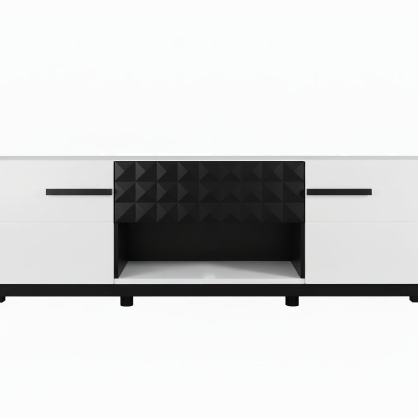 Tavolinë Televizori Sara 150 cm është një mobilje moderne me dizajn elegant dhe kontrast të theksuar mes ngjyrës së bardhë dhe detajeve të zeza. Fasada qendrore me teksturë gjeometrike i jep një karakter unik dhe bashkëkohor, duke e bërë këtë tavolinë një element të veçantë në ambientin e ndenjjes.