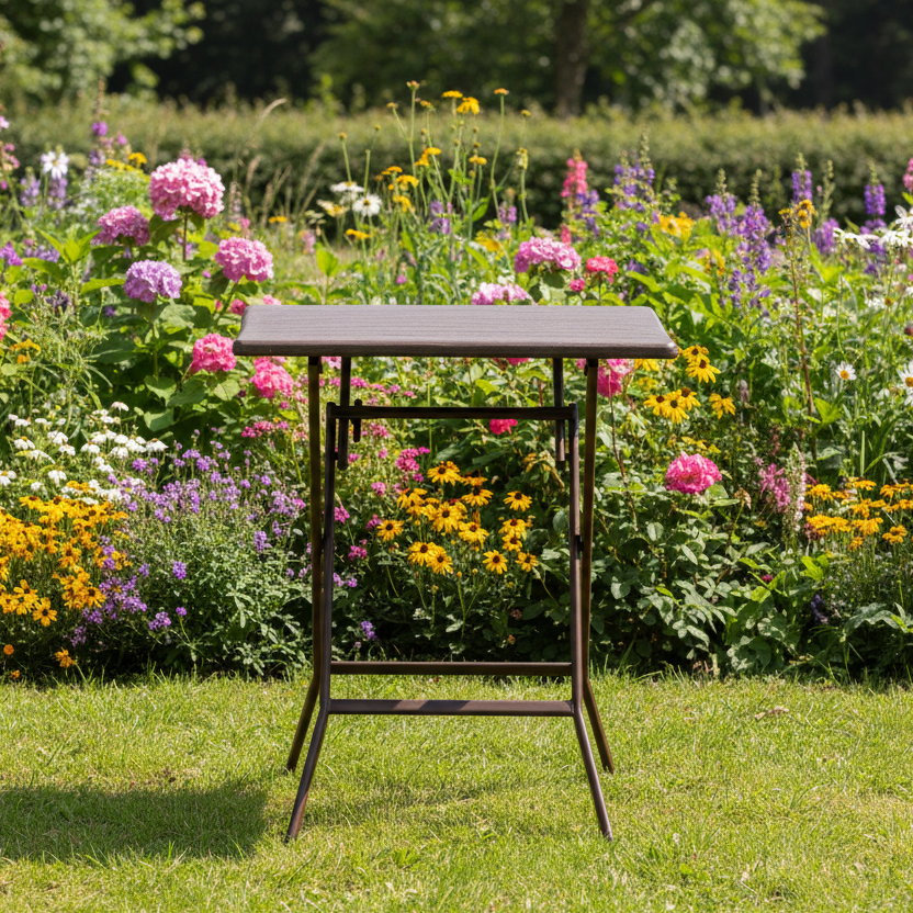 E ndërtuar me strukturë metalike të qëndrueshme, kjo tavolinë ofron stabilitet dhe përdorim afatgjatë. Mekanizmi i palosjes e bën shumë praktike për ruajtje, duke zënë hapësirë minimale kur nuk është në përdorim.