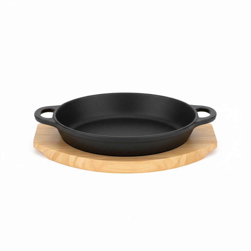 Kjo tenxhere rrethore nga gize masive siguron shpërndarje të barabartë të nxehtësisë, ideale për pjekje dhe grilime të një racioni individual. Sipërfaqja e saj e zezë jo e emaluar mban nxehtësinë për më gjatë dhe është perfekte për skuqje intensive në sobë ose në furrë. Dy dorezat anësore me vrima për gishta ofrojnë kapje të sigurt, ndërsa baza prej dru shtesë e kthen direkt nga furra në tavolinë.