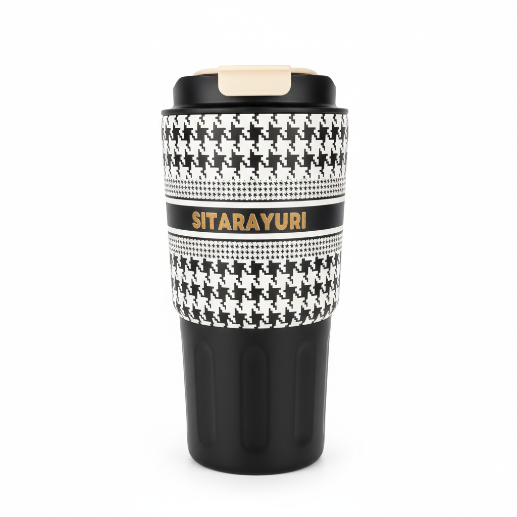 Kjo gotë udhëtimi me trup të lartë kombinon dizajnin modern me funksionalitet të përditshëm, ideale për kafe, çaj ose pije të tjera gjatë rrugës. Modeli klasik houndstooth bardh e zi i jep një pamje të sofistikuar që dallohet në zyrë, në makinë ose në udhëtime.