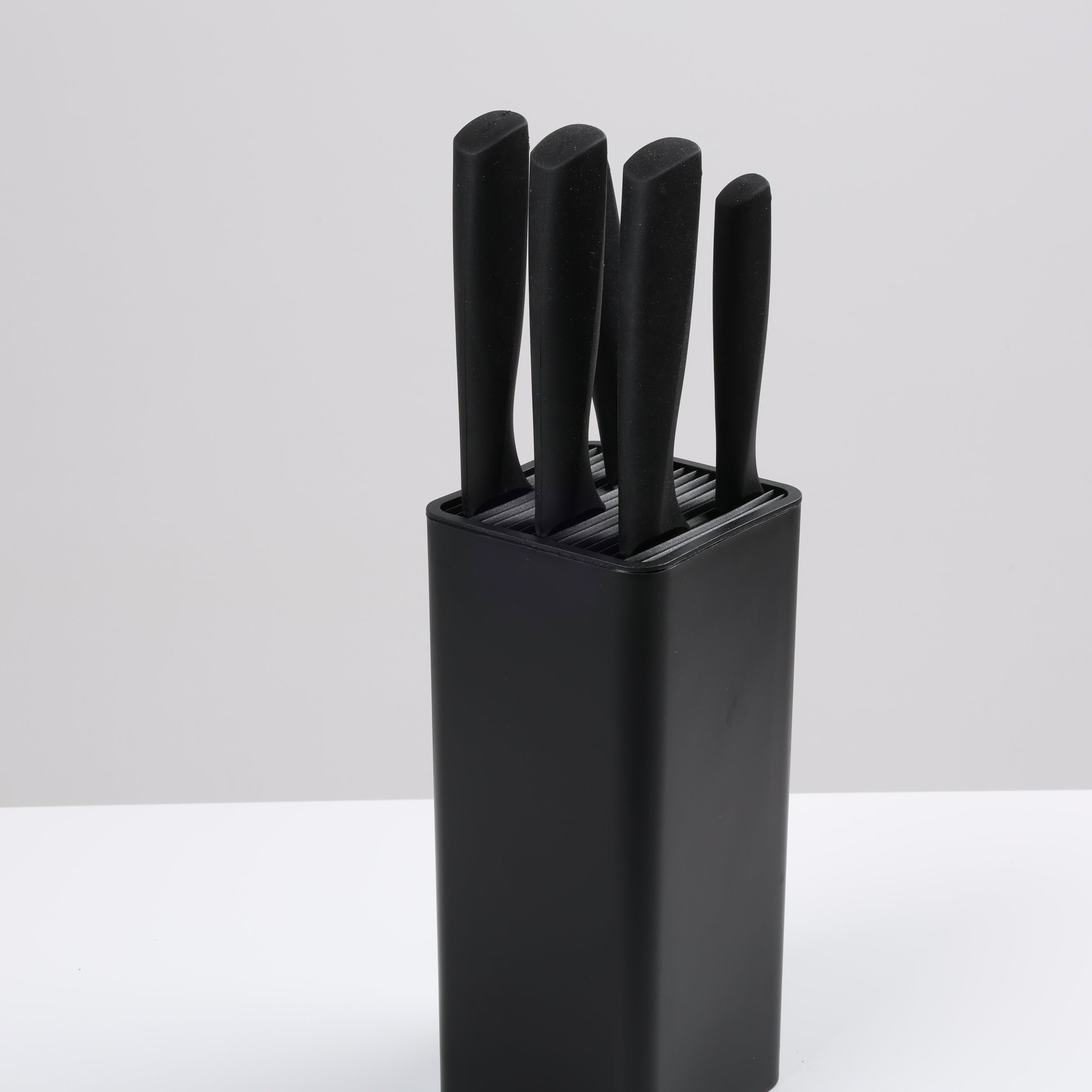 Dorezat ergonomike ofrojnë kapje të sigurt, ndërsa mbajtësja vertikale kursen hapësirë dhe i mban thikat gjithmonë të organizuara.