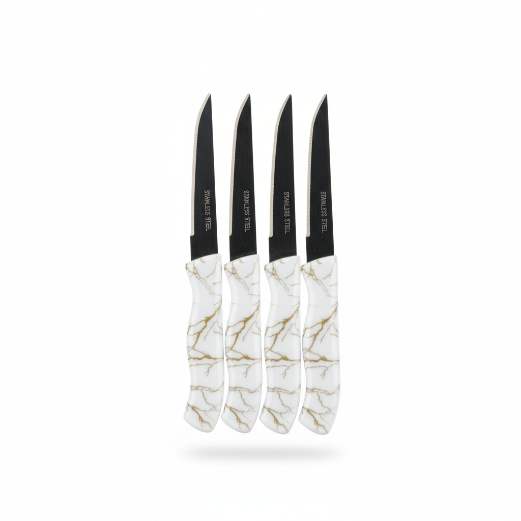 Set prej 4 thikash frutash me tehe inoksi dhe doreza plastike ergonomike me model mermeri të bardhë me vija ari, ideale për prerjen e frutave dhe ushqimeve të vogla. Dizajn i thjeshtë dhe praktik për përdorim të përditshëm në kuzhinë.
