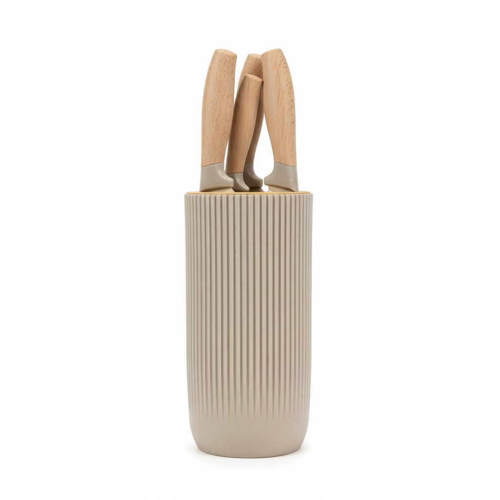Kjo pajisje praktike përmban një set prej 5 pjesësh, të kompletuara me bllok magazinimi cilindrik me vija vertikale që kursen hapësirë në planin e punës. Dorezat në ngjyrë bezhë me teksturë imitim druri ofrojnë pamje moderne dhe kapje të rehatshme për prerje të përditshme. Seti përfshin gjithashtu gërshërë kuzhine, duke e bërë ideal për çdo shtëpi apo si dhuratë elegante.