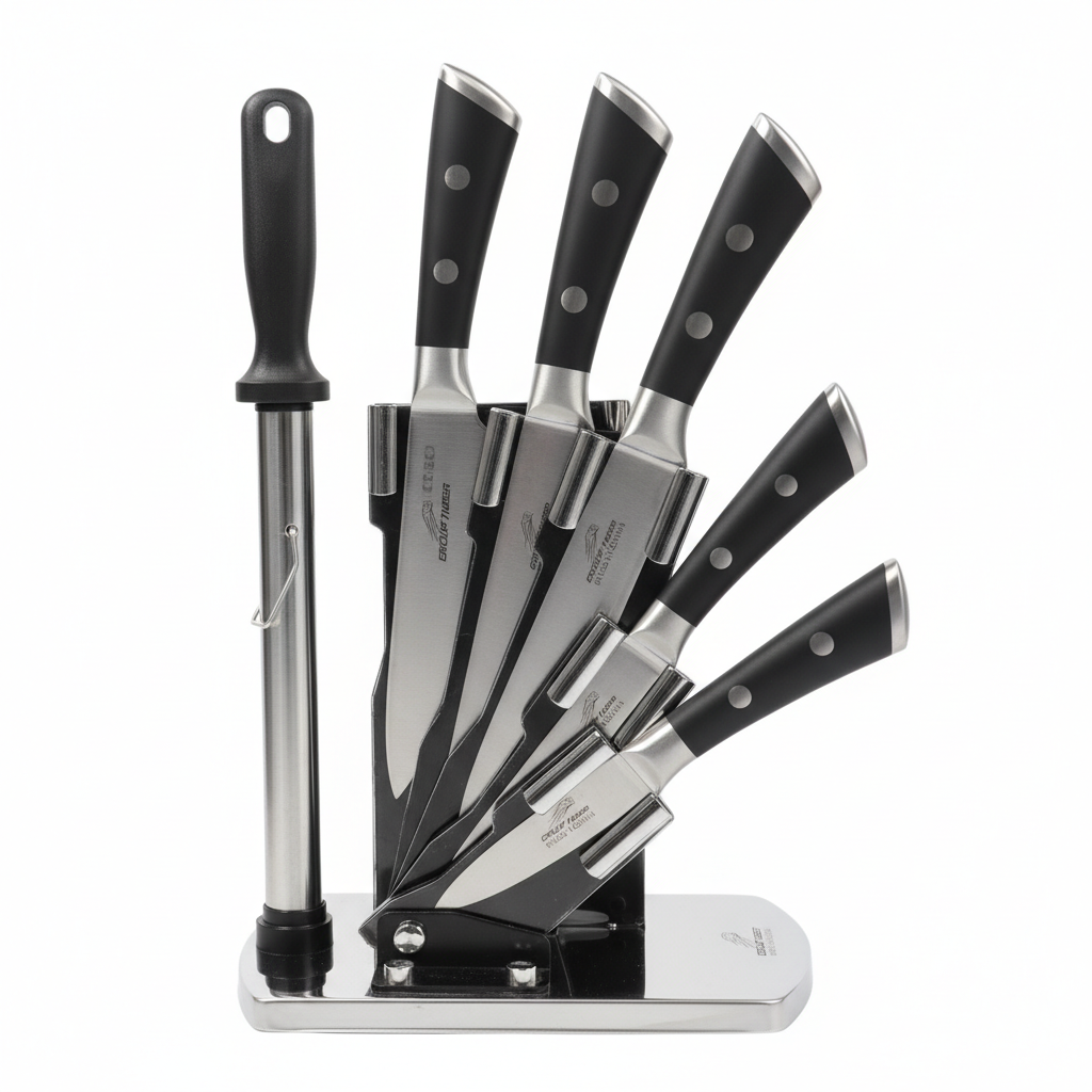 Seti përbëhet nga 7 pjesë inox me teh të mprehtë prej çeliku inoks, ideal për përgatitjen e përditshme të ushqimit në kuzhinë. Dorezat ergonomike në ngjyrë të zezë ofrojnë komfort dhe kontroll të sigurt gjatë prerjes, copëtimit dhe filetimeve. Kompleti vjen me shufër mprehëse dhe me një mbajtëse moderne për banak, e cila kursen hapësirë dhe e mban gjithmonë setin në rend.
