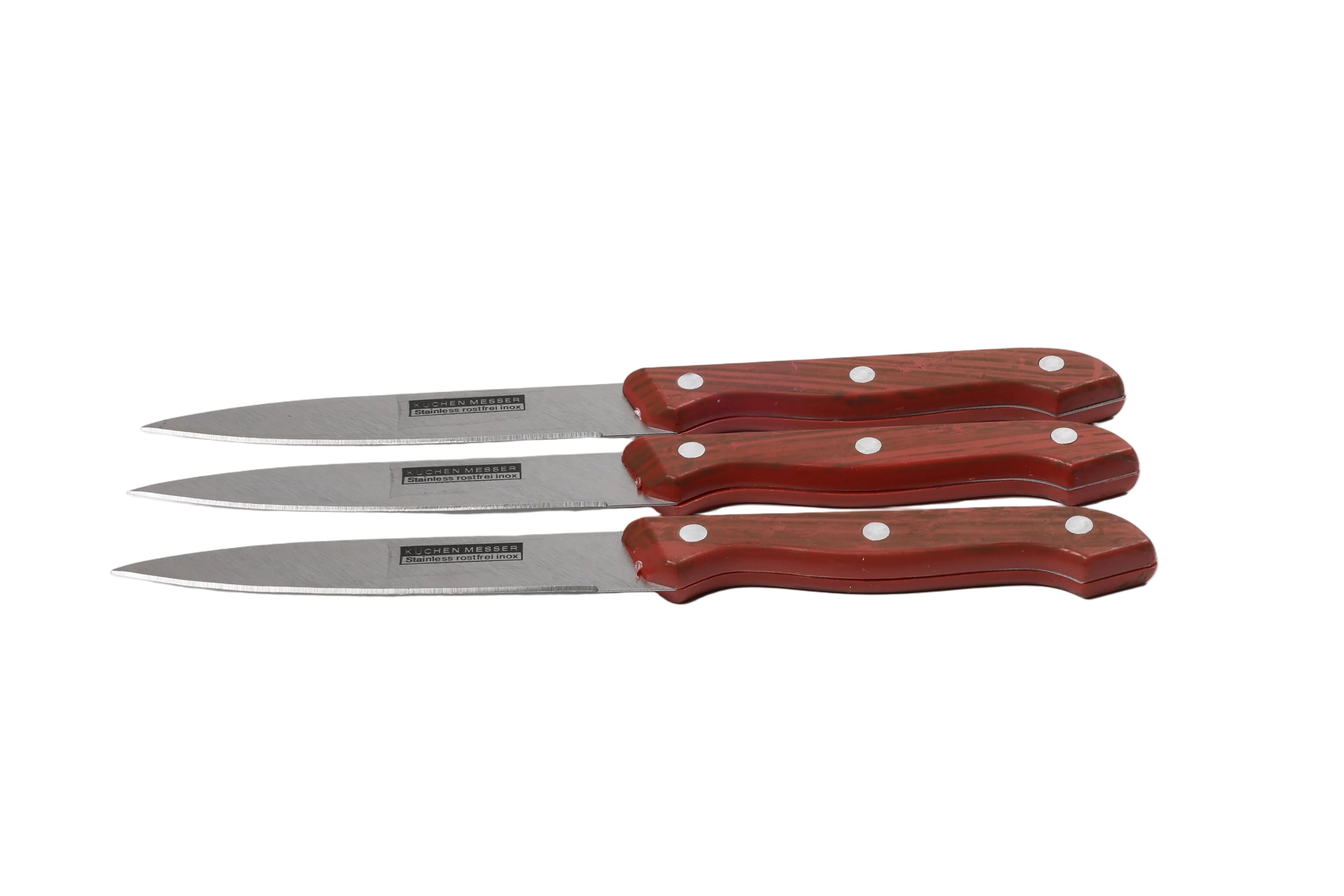 Set praktik me 3 thika kuzhine, të përshtatshme për përdorim të përditshëm në përgatitjen e ushqimeve. Tehet prej çeliku inox sigurojnë prerje të saktë dhe rezistencë ndaj ndryshkut, ndërsa dorezat ergonomike me pamje druri ofrojnë kapje të rehatshme dhe stil klasik.