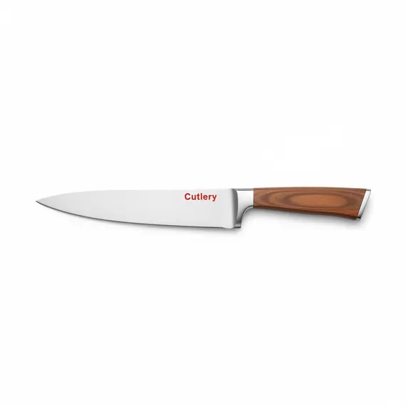Thikë profesionale kuzhine me teh 20 cm prej çeliku inoks dhe dorezë elegante druri, ideale për prerje të përditshme në kuzhinë. Pjesë e një game takëmesh që përfshin gjithashtu thika për kocka, prerëse dhe bukë.