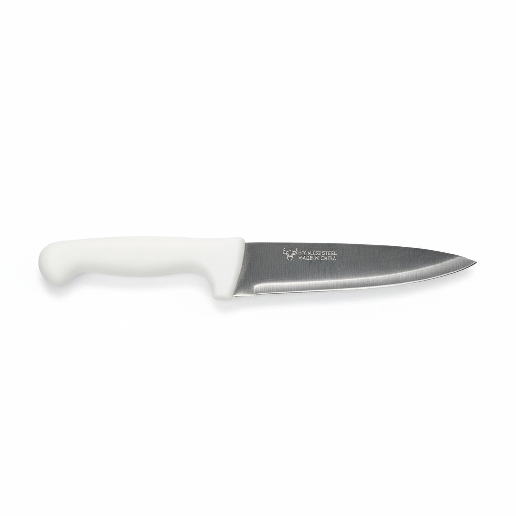 Thikë kuzhine profesionale me teh inox 6" dhe dorezë ergonomike të bardhë, e përshtatshme për përgatitjen e ushqimit në kuzhinë shtëpie ose profesionale.