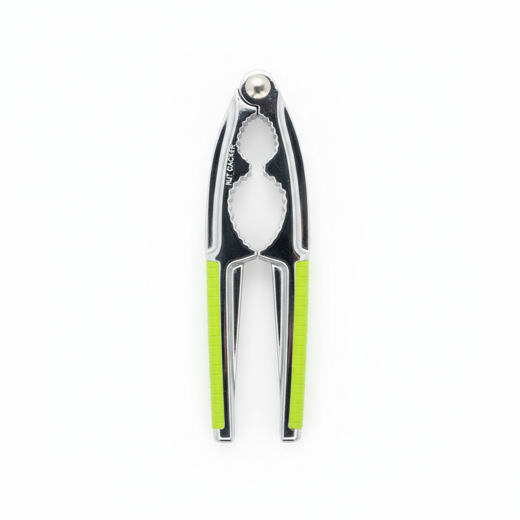 Mjet praktik kuzhine prej metali për çarjen e arrave, me doreza ergonomike me kapëse jeshile për përdorim të rehatshëm.