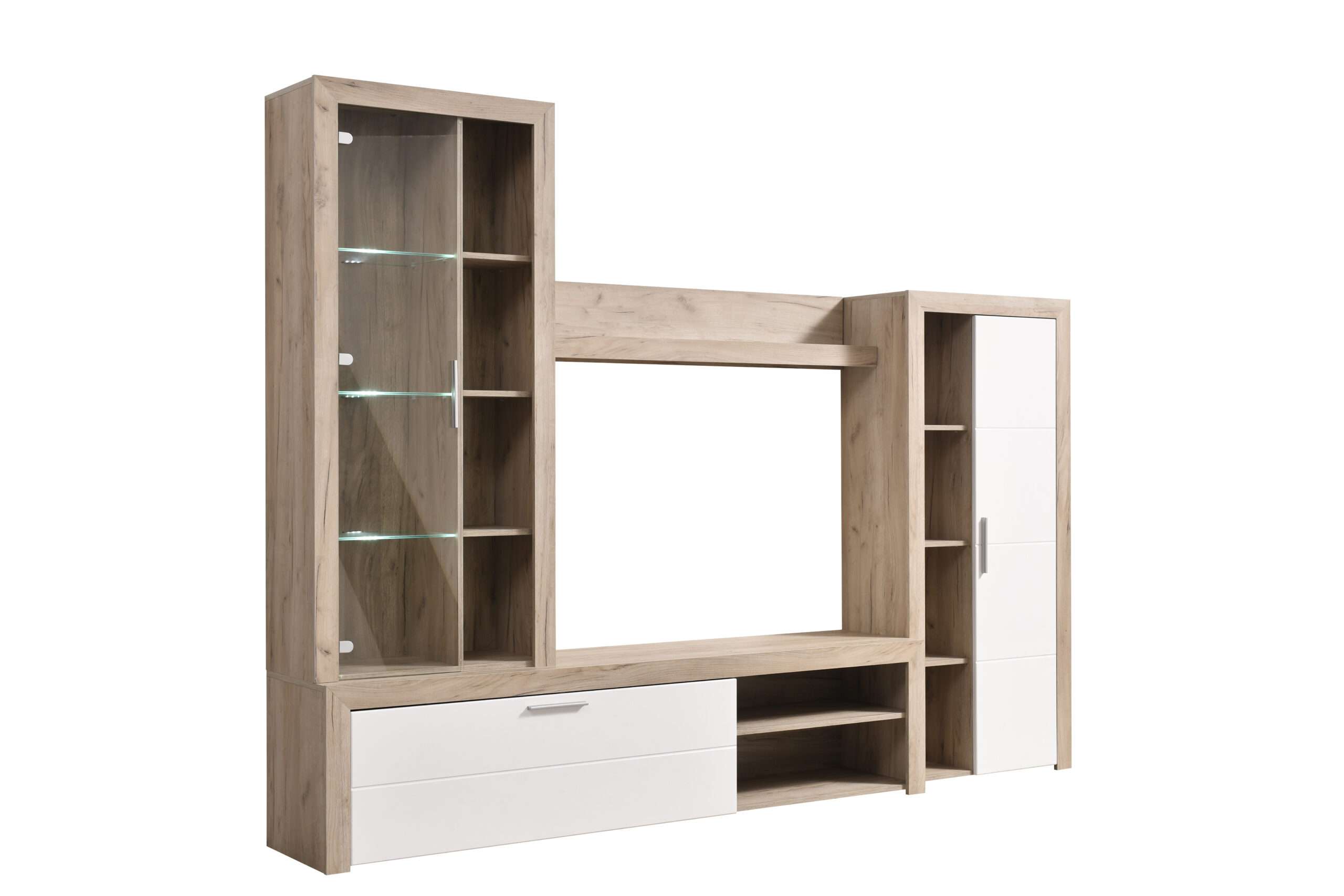 Mobilja TV Mignon kombinon stilin modern me funksionalitetin praktik, duke sjellë një zgjidhje elegante për ambientin e sallonit. Kombinimi i ngjyrës së drurit natyral me elemente të bardha krijon një pamje të pastër dhe bashkëkohore, ndërsa vitrinat me xham dhe ndriçim i japin një prekje dekorative hapësirës.