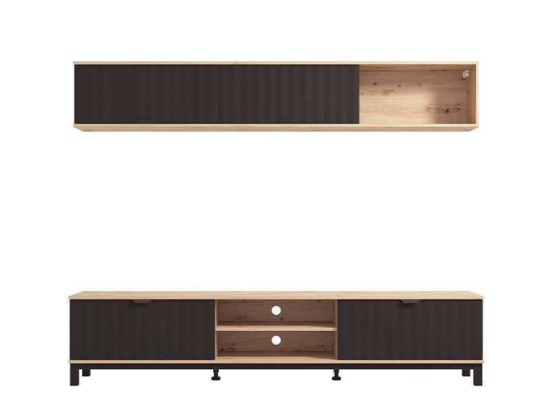 Set modern për sallon, i përbërë nga komodë TV dhe raft muror në kombinim elegant dru natyral dhe nuancë të errët. Dizajni minimalist dhe linjat e pastra e bëjnë këtë set të përshtatshëm për ambiente bashkëkohore, duke ofruar hapësirë praktike për pajisje elektronike dhe dekor.