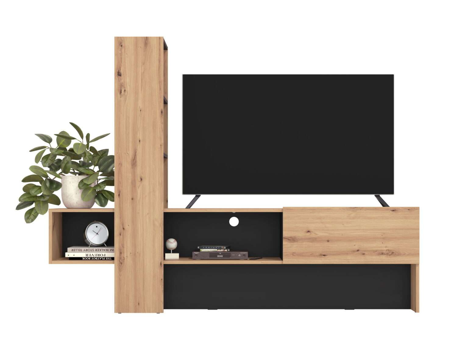 Komoda TV Orleana sjell një kombinim modern të drurit natyral me elemente të zeza, duke krijuar një pamje elegante dhe bashkëkohore për ambientin e sallonit. Dizajni asimetrik me element vertikal dhe ndarje të hapura ofron hapësirë praktike për pajisje elektronike, libra apo dekor.