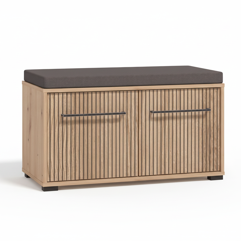 Pjesa e sipërme është e pajisur me një jastëk të rehatshëm, duke e bërë ideal për korridor apo hyrje – perfekt për t’u ulur gjatë veshjes së këpucëve. Dyert me panel dekorativ dhe dorezat metalike horizontale krijojnë një pamje bashkëkohore dhe të rafinuar.