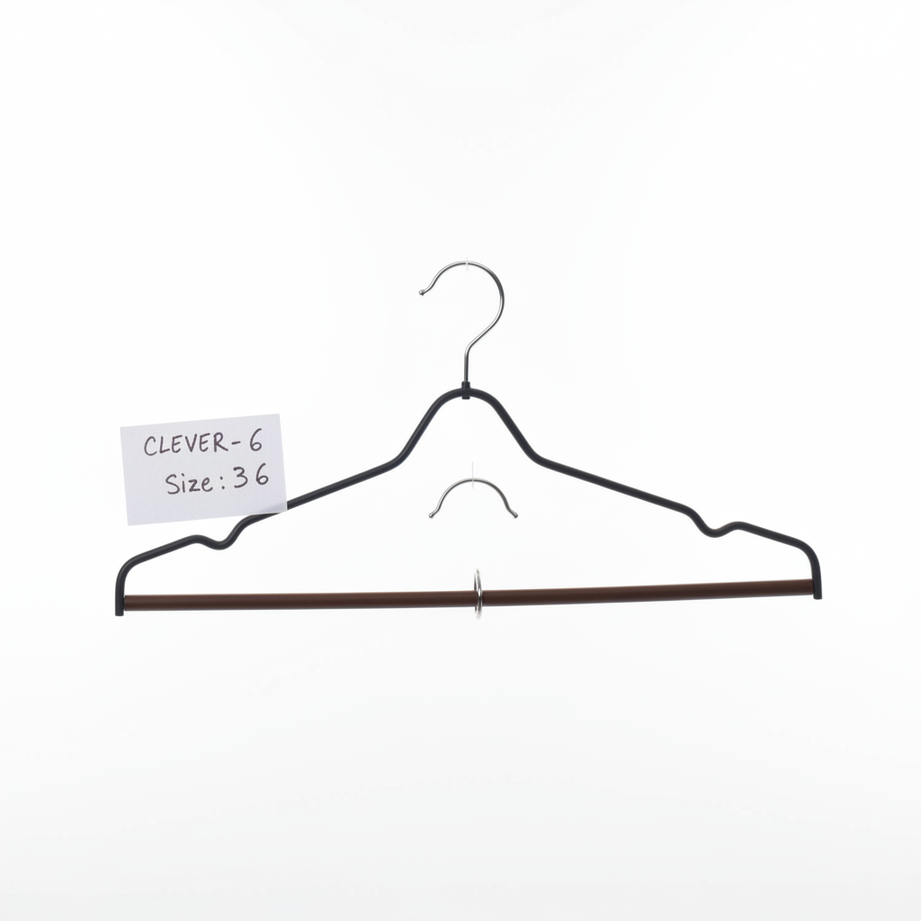 Varëse rrobash metalike CLEVER-6 me madhësinë 36, e pajisur me shufër të drejtë poshtë për rregullim të lehtë të gardërobës. Ideale për organizimin e këmishave, xhaketave dhe pantallonave në shinat e dollapit.