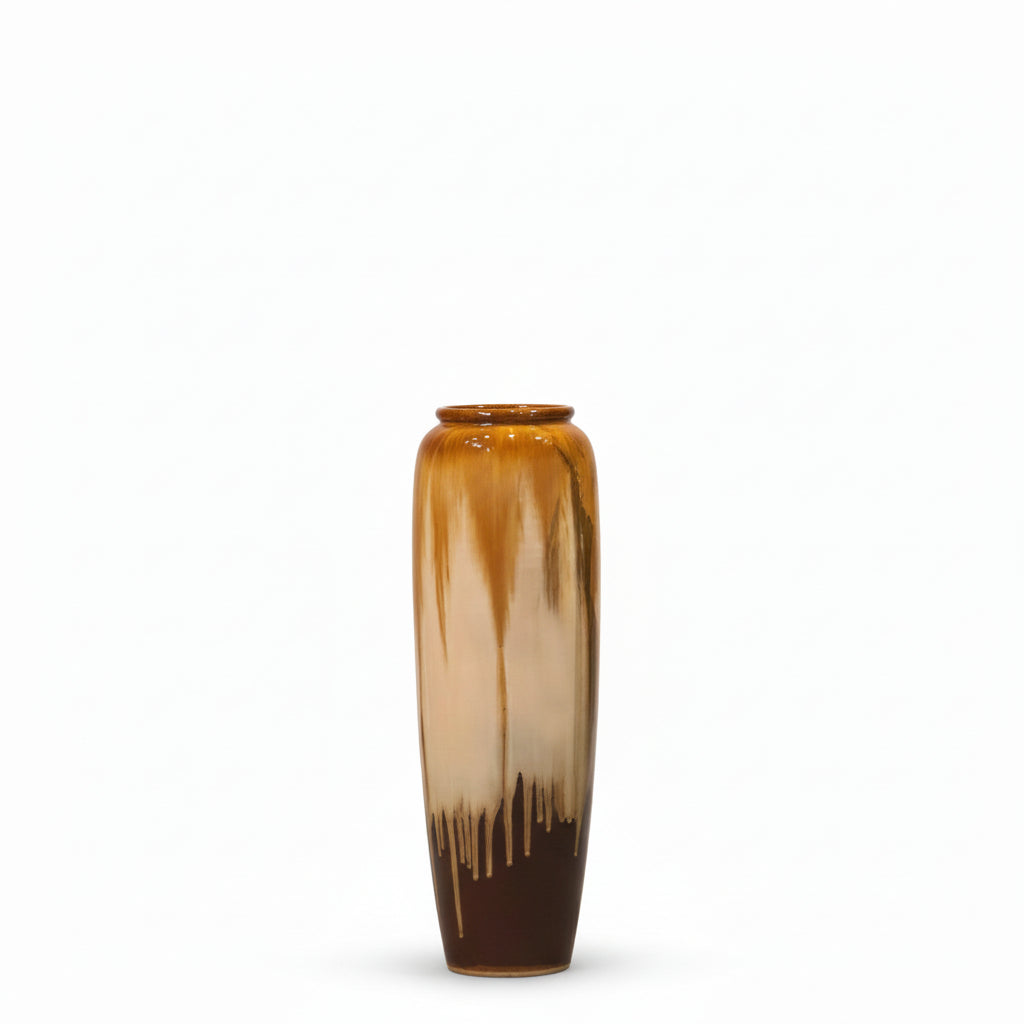 Vazo dekorative me dizajn elegant dhe përfundim artistik në nuanca të ngrohta, që krijon një efekt unik vizual. Forma e gjatë dhe linjat e buta e bëjnë një element të spikatur për çdo ambient modern apo klasik.