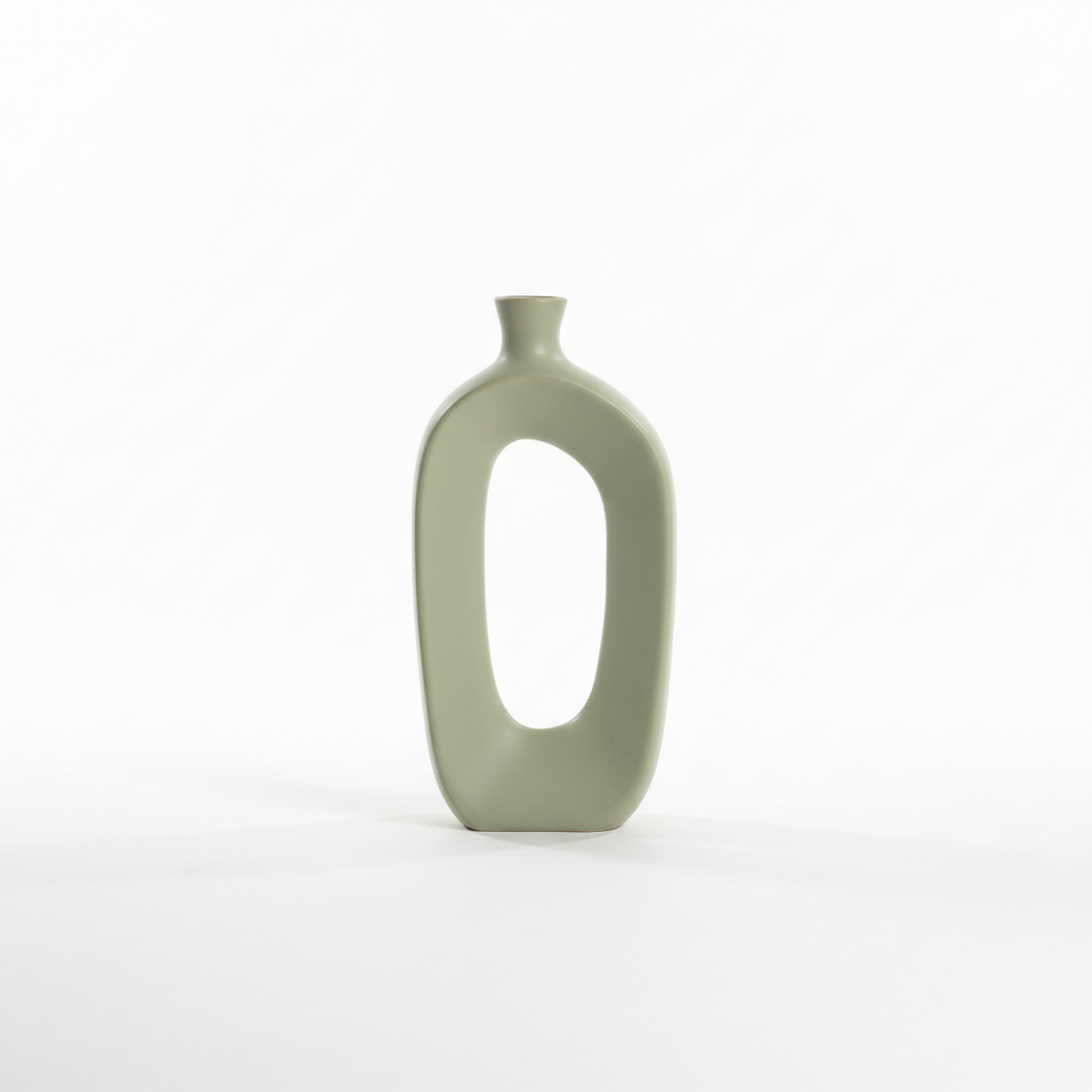 Vazo dekorative qeramike me trup në formë unaze dhe përfundim mat që i jep çdo ambienti një prekje moderne dhe elegante. Ideal për ta ekspozuar si objekt dizajni ose për kombinime me lule të thara.