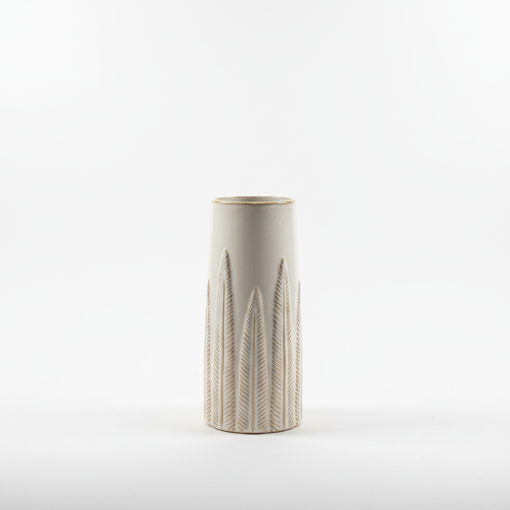 Vazo dekorative qeramike e lartë me formë cilindrike dhe reliev elegant gjetheje, ideale si theks modern në çdo ambient. Përfundimi me glazurë i jep shkëlqim të butë dhe e bën të përsosur si element më vete ose me pak degë dekorative.