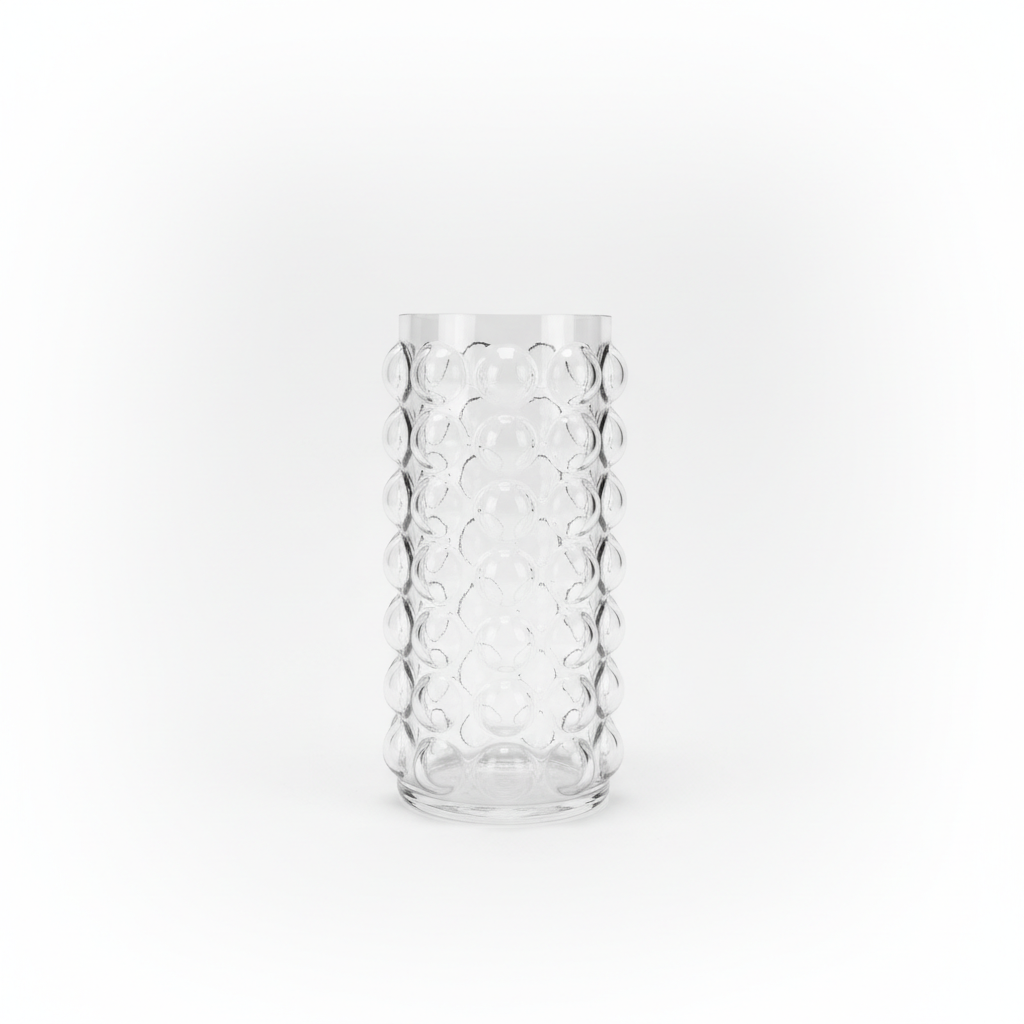 Kjo vazo qelqi transparente me reliev flluskash sjell një prekje moderne dhe dekorative në çdo ambient, e përshtatshme për lule ose kompozime dekorative.