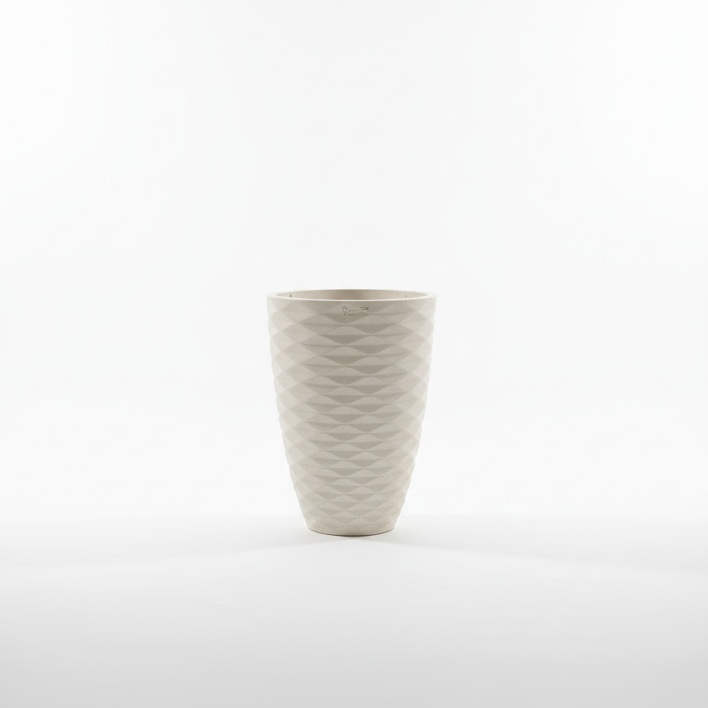 Vazoja dekorative plastike në ngjyrë chalk beige me formë të lartë të ngushtuar dhe model gjeometrik teksturor i jep një pamje moderne çdo ambienti. Përmasat 35×35×48 cm e bëjnë të përshtatshme për bime dekorative në dhomë, korridor apo zyrë.