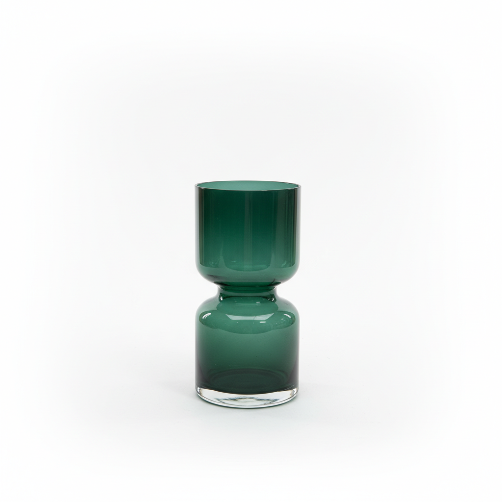 Mbajtëse qiriri prej xhami me ngjyrë jeshile, me formë moderne rërëore dhe hapje të sipërme për vendosjen e qiririt, që sjell elegancë diskrete në çdo ambient.