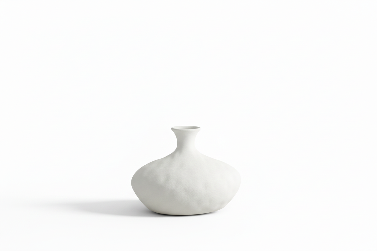 Vazo dekorative në ngjyrë të bardhë me dizajn modern dhe formë organike elegante. Silueta e rrumbullakosur me qafë të hollë krijon një pamje të butë dhe harmonike, ndërsa përfundimi matte me teksturë delikate i jep karakter dhe stil.