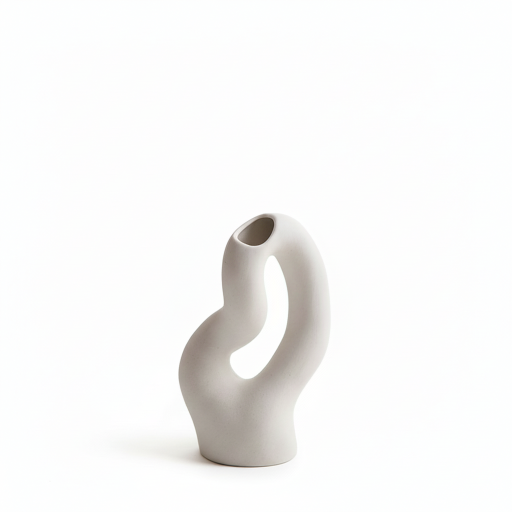 Vazo dekorative me dizajn modern dhe formë organike skulpturore. Linjat e lakuara dhe hapësira e brendshme krijojnë një siluetë elegante dhe artistike, duke e bërë këtë vazo një element unik në çdo ambient.