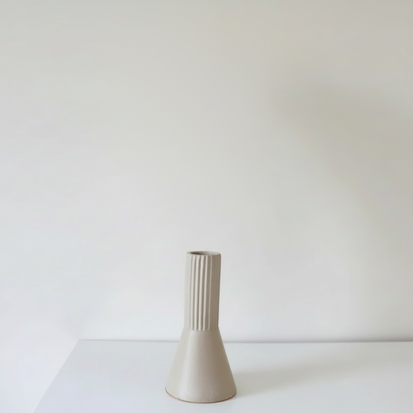 Vazo dekorative me dizajn elegant dhe formë të ngushtë vertikale, e kombinuar me bazë të zgjeruar në stil modern minimalist. Detaji me vija vertikale në pjesën e sipërme i shton teksturë dhe karakter, duke e bërë një element dekorativ të rafinuar.