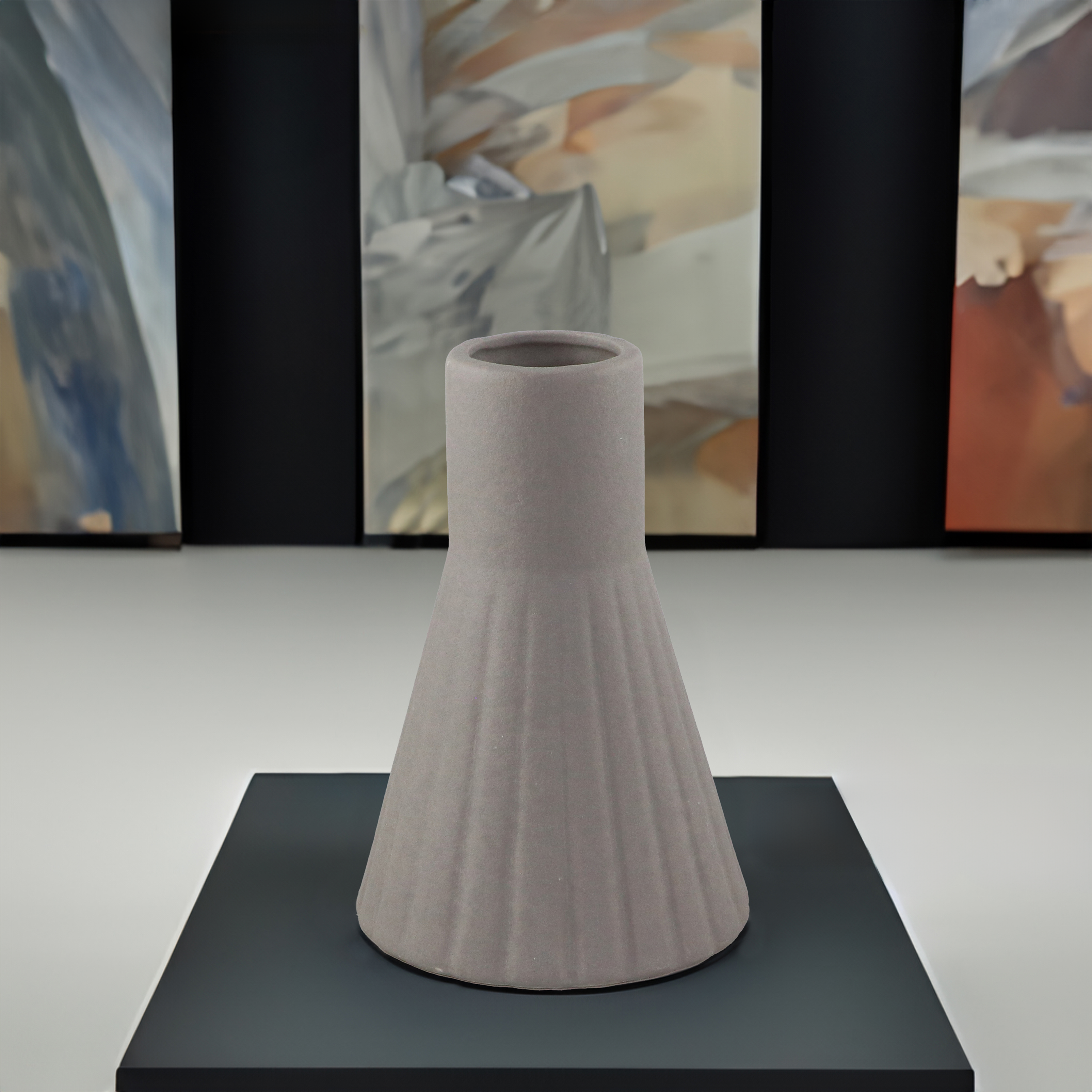 Vazo dekorative abstrakte me formë koniçale të zgjeruar dhe teksturë vertikale, e punuar në qeramikë me përfundim mat për një pamje moderne dhe elegante në çdo ambient.