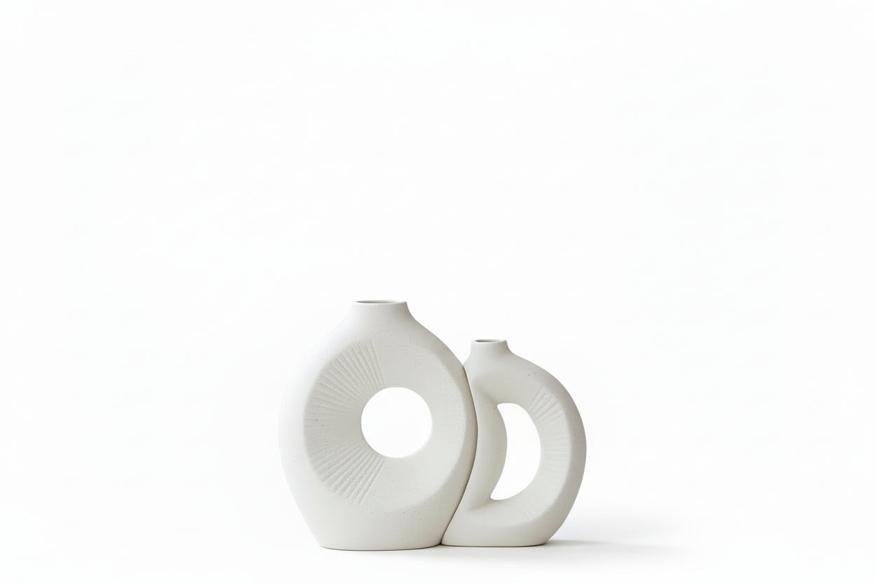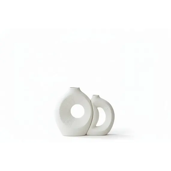 Set vazosh dekorative me dizajn modern dhe formë rrethore me hapje qendrore, që krijojnë një efekt skulpturor unik. Ngjyra e bardhë natyrale me teksturë matte dhe detaje delikate radiale i jep një pamje elegante dhe minimaliste.