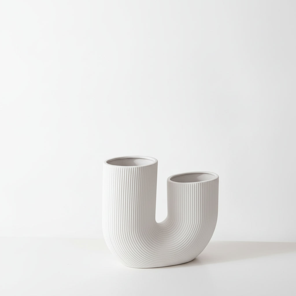 Vazo dekorative moderne me formë unike “U” dhe teksturë me vija vertikale në reliev, e dizajnuar për të krijuar një efekt elegant dhe minimalist në çdo ambient. Forma e saj skulpturore e bën një element dekorativ të veçantë, edhe kur përdoret pa lule.